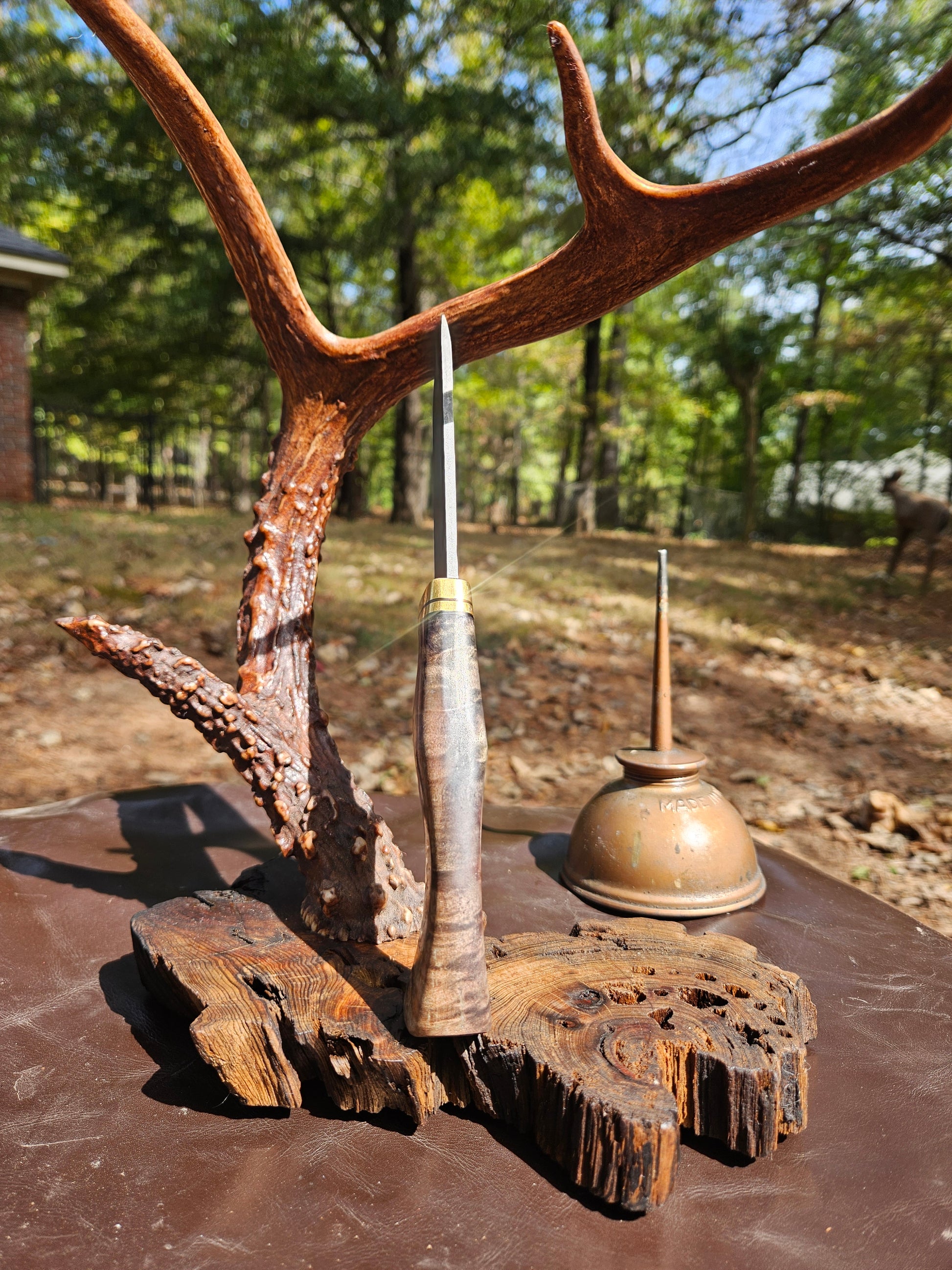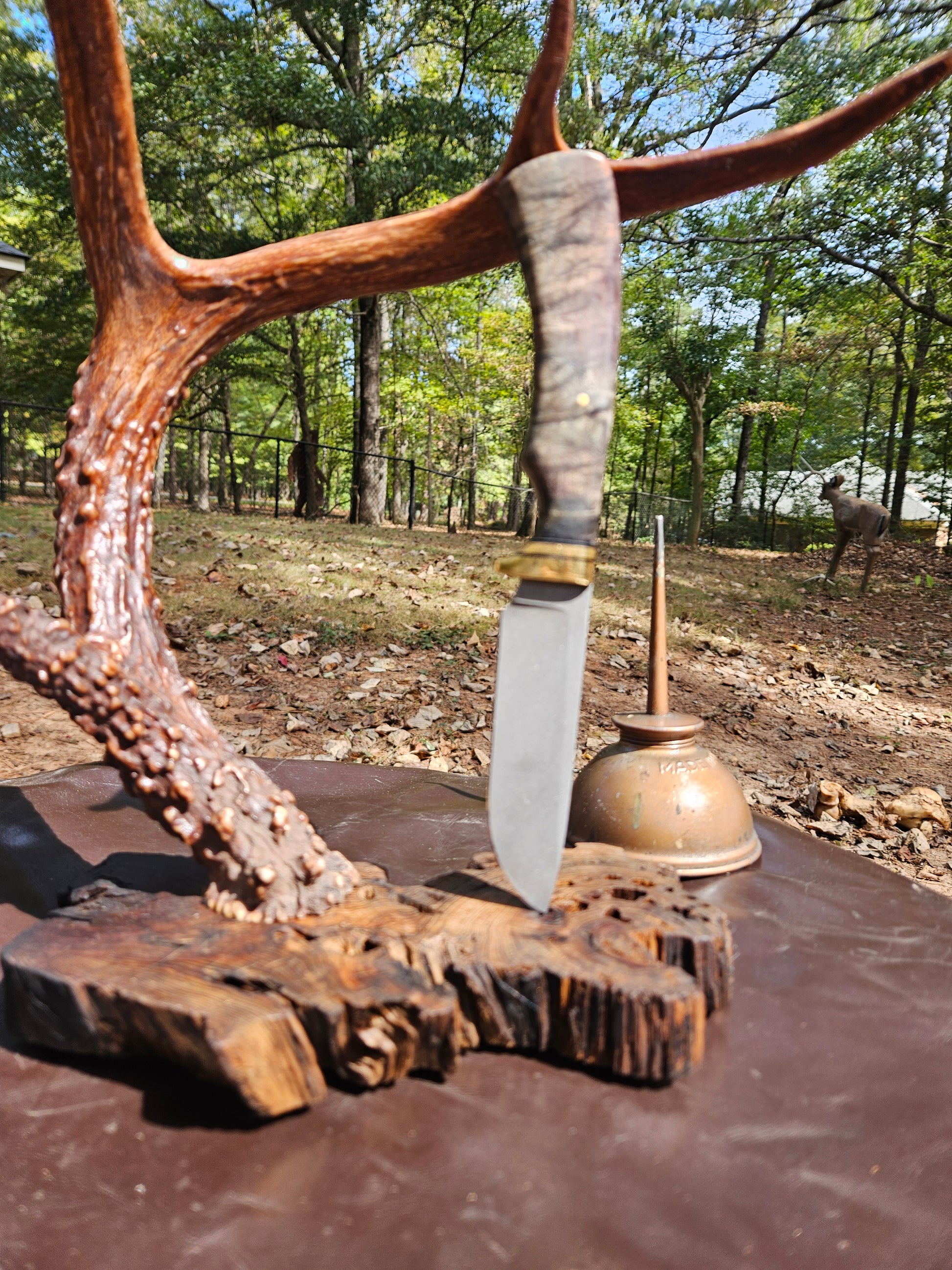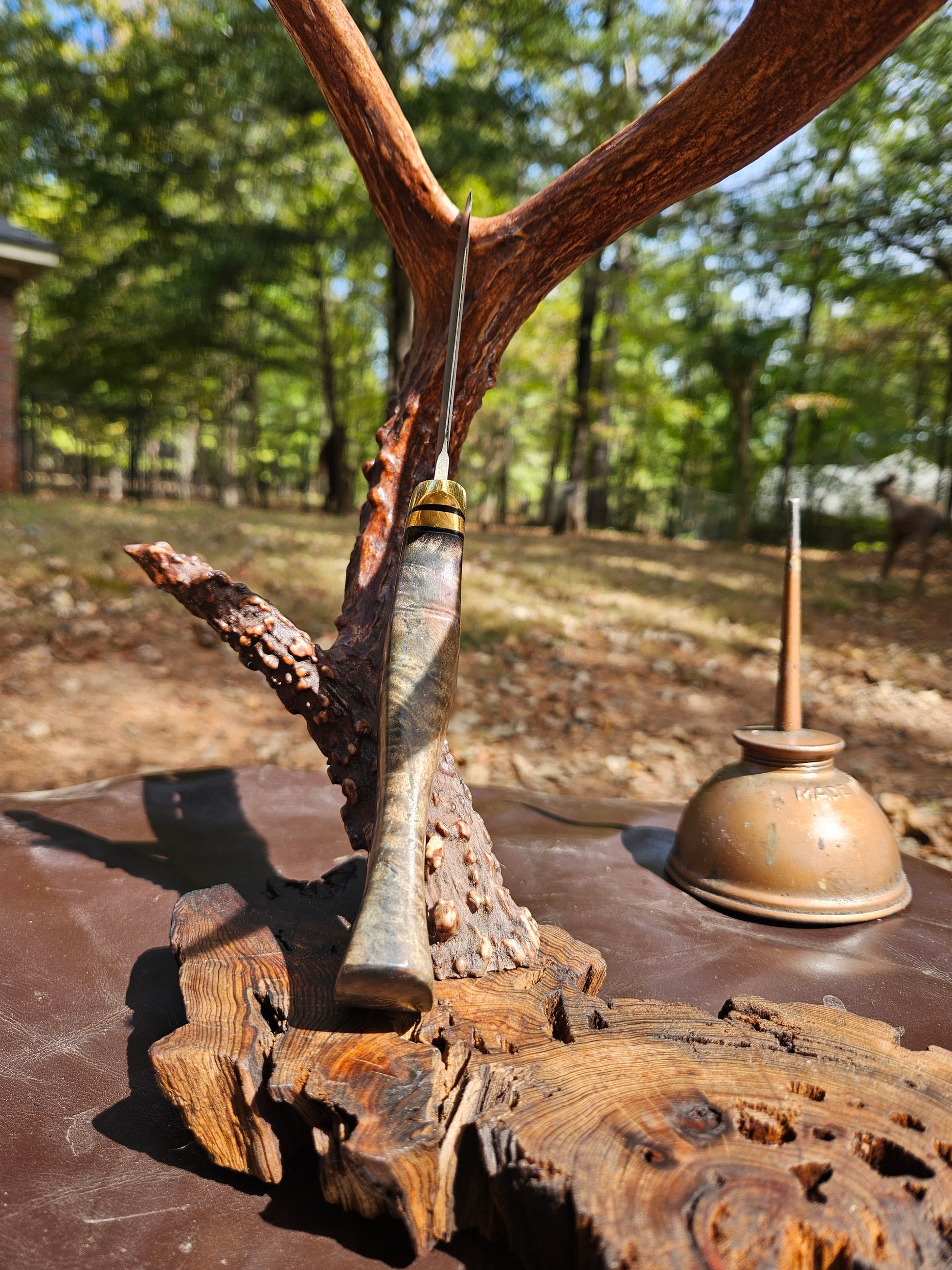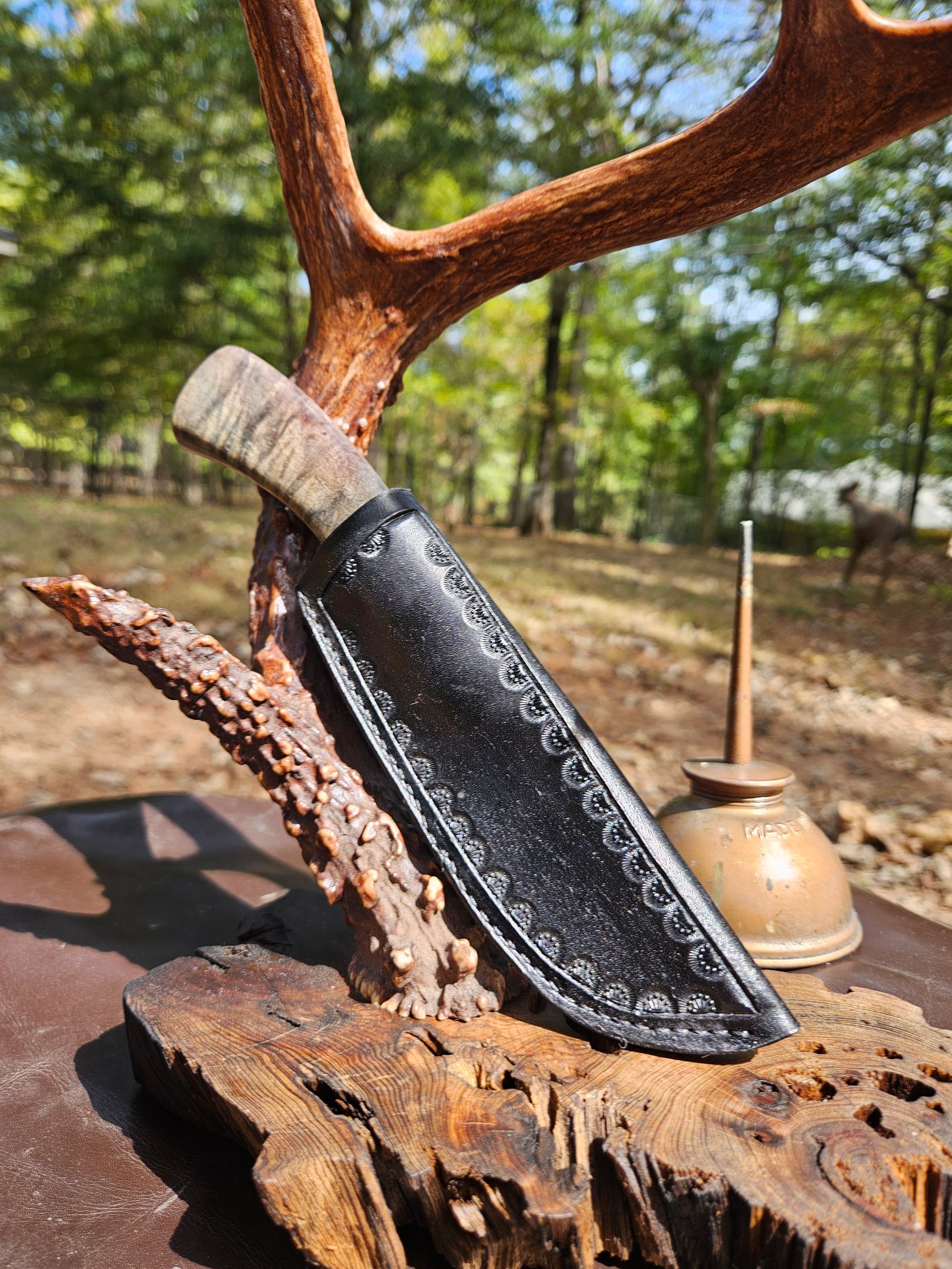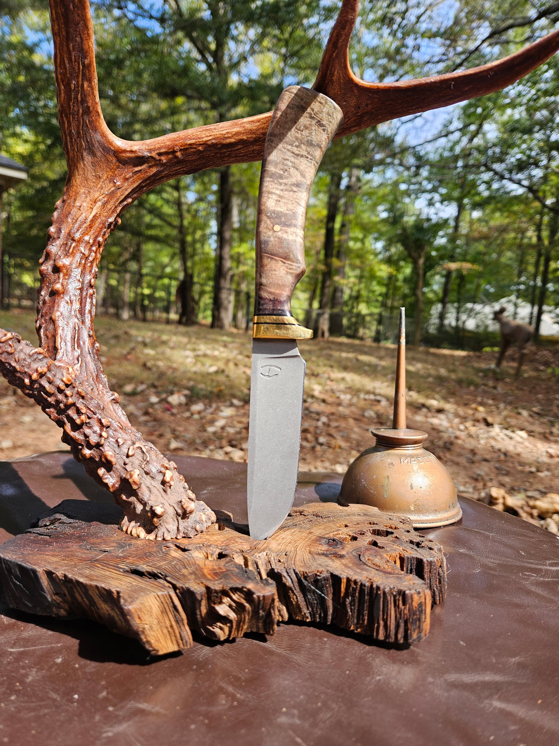 My Hunter model 8.5" overall cpm154 stainless steel hidden tang design with Koa handle. Comes with right handed leather sheath.