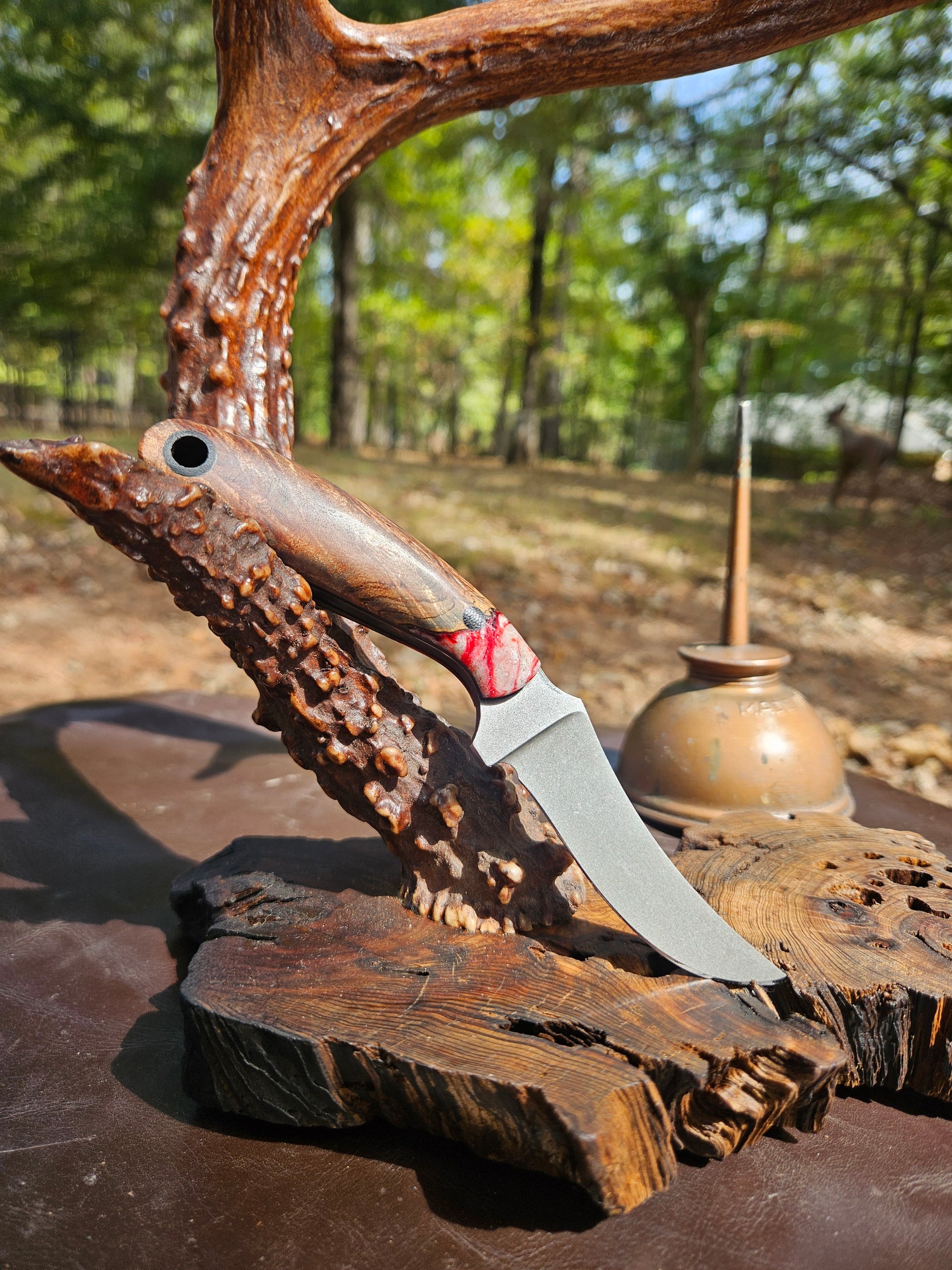 Sharpfinger Junior in cpm154 stainless steel with maple burl and resin handle scales with kydex sheath.